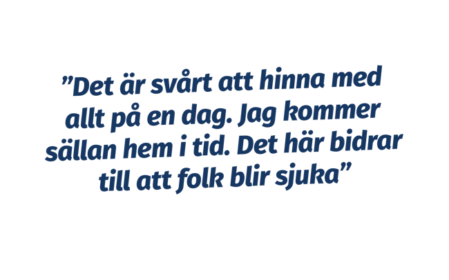 En av våra medlemmar beskriver det som: ”Det är svårt att hinna med allt på en dag. Jag kommer sällan hem i tid. Det här bidrar till att folk blir sjuka”.
